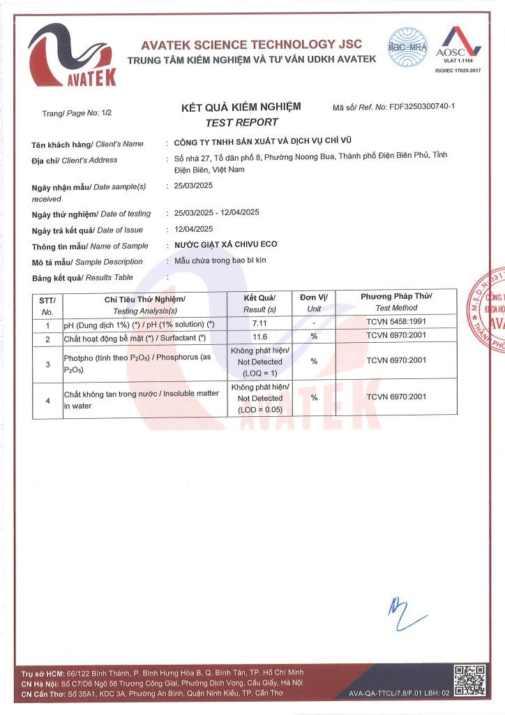 Ngày 12/04 vừa qua CHIVU ECO đã vượt qua kiểm định của AVATEK về chất lượng sản phẩm nước giặt. Nước giặt CHIVU ECO là một sản phẩm giặt tẩy tiên tiến, được nghiên cứu và phát triển với công thức thân thiện với môi trường. Sản phẩm này đã trải qua quá trình kiểm nghiệm nghiêm ngặt tại AVATEK, đảm bảo đáp ứng các tiêu chuẩn chất lượng và an toàn cho người sử dụng. Quy trình kiểm nghiệm tại Trung tâm AVATEK Trung tâm AVATEK đã tiến hành kiểm nghiệm nước giặt CHIVU ECO theo các tiêu chí quan trọng như: Thành phần an toàn: Không chứa hóa chất độc hại, đảm bảo an toàn cho da và sức khỏe người dùng. Hiệu quả giặt tẩy: Khả năng loại bỏ vết bẩn hiệu quả trên nhiều loại vải khác nhau. Độ phân hủy sinh học: Sản phẩm có khả năng phân hủy tốt, giúp bảo vệ môi trường. Không gây kích ứng: Được kiểm nghiệm để đảm bảo không gây kích ứng da, phù hợp với cả làn da nhạy cảm. Việc kiểm định nước giặt tại AVATEK mang lại nhiều lợi ích: Đảm bảo an toàn cho người dùng: Giúp người tiêu dùng yên tâm khi sử dụng sản phẩm. Nâng cao uy tín thương hiệu: Chứng nhận kiểm định giúp sản phẩm được đánh giá cao trên thị trường. Mở rộng kinh doanh: Tiếp cận nhiều thị trường trong nước và quốc tế. Đồng thời hợp tác với nhiều đối tác lớn. Chứng nhận từ Trung tâm AVATEK – Cam kết chất lượng Việc đạt chứng nhận từ Trung tâm AVATEK không chỉ là minh chứng cho chất lượng của nước giặt CHIVU ECO mà còn là sự cam kết về độ an toàn và hiệu quả của sản phẩm. Với sự kiểm định nghiêm ngặt, CHIVU ECO tự tin mang đến một giải pháp giặt tẩy hoàn hảo, đáp ứng nhu cầu của người tiêu dùng hiện đại.
